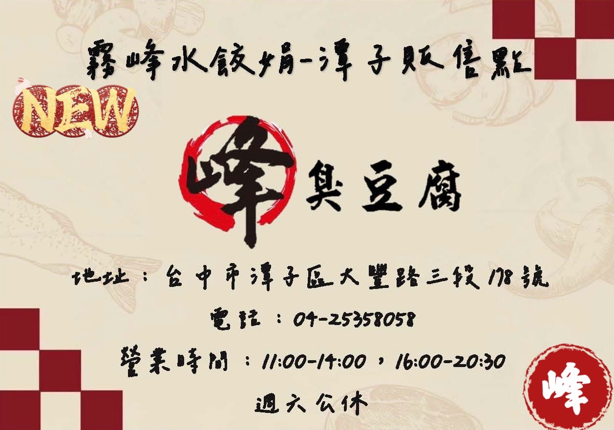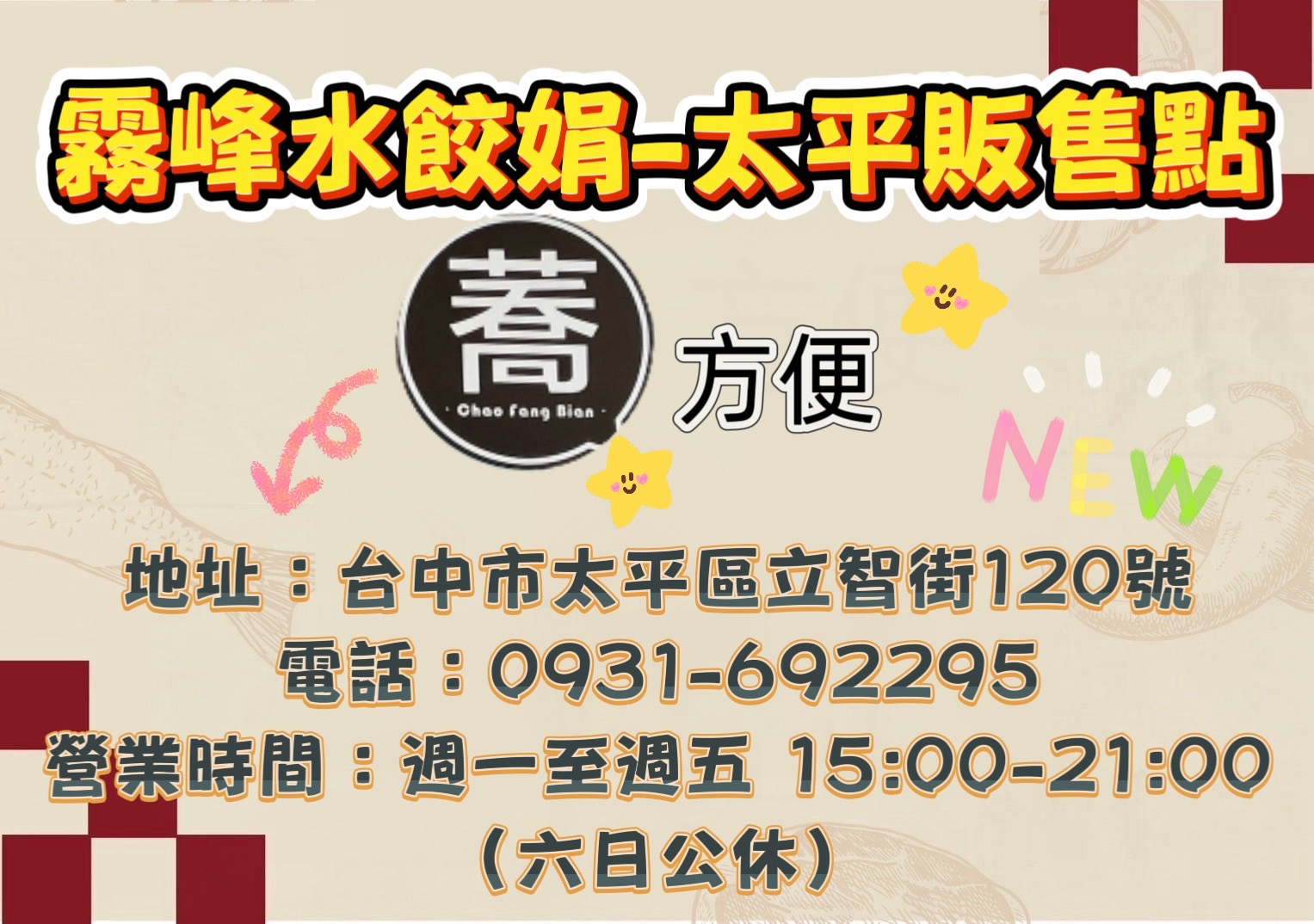 南屯販售點 - 嗨膳(丸洋)海鮮專賣店 地址:台中市南屯區向上路三段495號 電話:04-23891120 營業時間:9:00-19:30 (週一)                  7:00-19:30 (週二到週六)                  7:00-18:30 (週日) 網址:http://www.hiseafood.com.tw/   西屯販售點 - 鮮物配 地址:台中市西屯區青海路二段61號 電話:04-23161618 營業時間:9:00-19:00 (週一到週五)                   (六日公休) 網址:https://www.fresh4u.com.tw/productAll   西屯區販售點 - 永益商行 地址:台中市西屯區逢明街98號 電話:04-24520331 營業時間:8:00 - 19:00 (週日公休) 網址:https://www.facebook.com/shangshi168168   北屯區販售點 - 春樹鮮果 地址:台中市北屯區興安路二段443號 電話:04-22478009 營業時間:10:00 - 20:00 (週一至週五)、10:00 - 17:00 (週六)、週日公休 網址:https://m.facebook.com/spring.tree.2017.06/   南區販售點- 生吉食材商行 地址:台中市南區建國南路一段192號 (大慶夜市旁) 電話:04-22612672 營業時間:08:30-19:00(週一~週五)    13:00-19:00(週六、週日) 網址:https://www.facebook.com/sh0422612672 南區販售點-詠旭商行 地址:台中市南區美村南路57號 電話:04-22655797 營業時間:週一至週六早上8點~晚上7點 (週日公休) 太平區販售點 - 蕎方便團購 地址:台中市太平區立智街120號 電話:0931-692295 營業時間:週一至週五15:00 - 21:00(週六、週日公休)   大肚販售點 - 小可愛芋圓(大肚公有市場內) 地址:台中市大肚區沙田路二段713巷5號 電話:04-26991241 營業時間:8:00-20:00 (每天都有營業)   大雅販售點 - 隆盛雜貨商行 地址:台中市大雅區中清東路128號 電話:04-25690331 營業時間:07:30-19:00 (週一~週六)                  08:30-12:00 (週日) 網址:https://www.facebook.com/%E9%9A%86%E7%9B%9B%E9%9B%9C%E8%B2%A8%E5%95%86%E8%A1%8C-102072368197492   南投販售點 - 珠珠金愛嘉 地址:南投市中山街282號 電話:0937711816 營業時間:11:00-21:00  (週日公休) 網址:https://www.facebook.com/groups/282209679258134/   沙鹿販售點- 宥馳團購 地址:台中市沙鹿區北中六街15號 (炙馥鐵板燒隔壁)(莫尼早午餐對面) 電話:0963152334 營業時間: 週二~週五 11:30-19:30 週六11:30-17:00 (週日、週一公休) 網址:https://www.facebook.com/cholove2014/   潭子販售點- 峰  臭豆腐 地址:台中市潭子區大豐路三段178號 電話:04-25358058 營業時間:11:00–14:00, 16:00–20:30 (週六休息) 網址:https://www.facebook.com/p/%E5%B3%B0-%E8%87%AD%E8%B1%86%E8%85%90-100078040100446/